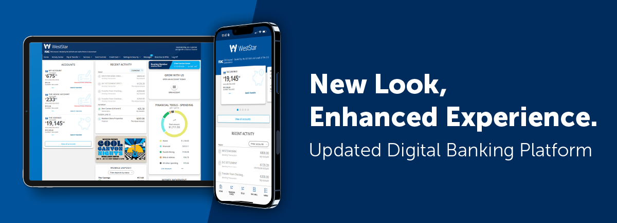 We are excited to share that WestStar is updating its Digital Banking platform* on September 18, 2025. This enhanced experience will feature a redesigned dashboard with new tools and features to give you greater control and quicker access to your finances.